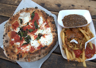 We take a lunch break from OSMI and drive to the food cart pod on 12th and Hawthorne. This is a small pod of only six carts, but all of them sound delicious and we have difficulty deciding what we want. One choice for sure is “Potato Champion”. She has a crazy selection of french fry concoctions. Fred chooses fries smothered in chili, cheese and pulled pork. I pick the Pyro Pizza cart and a wood-fired mozzarella cheese and basil pizza. We are both happy with our choices.